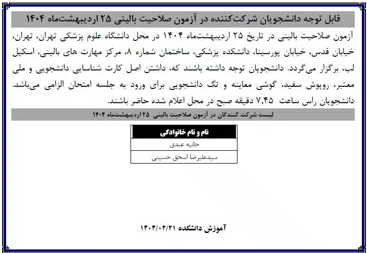 اطلاع رسانی فوری به دانشجویان شرکتکننده در آزمون صلاحیت بالینی 25 اردیبهشتماه 1404