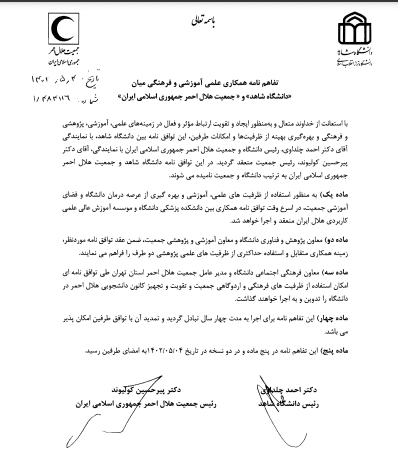 در ماده یک تفاهم نامه آمده است که به منظور استفاده از ظرفیت های علمی، آموزشی و بهره گیری از عرصه درمان دانشگاه و فضای آموزشی جمعیت در اسرع وقت توافق نامه همکاری بین دانشکده پزشکی دانشگاه و موسسه آموزش عالی علمی-کاربردی هلال ایران، منعقد و اجرا خواهد شد.