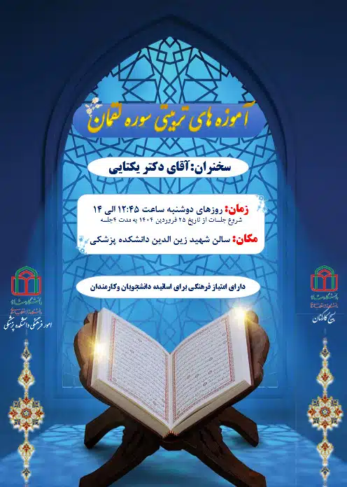جلسات آموزه‌های تربیتی سوره لقمان برای دانشجویان، اساتید و کارمندان در روزهای دوشنبه از ۲۵ فروردین ماه به مدت ۴ جلسه از ساعت ۱۲:۴۵ الی 13:45 برگزار می‌گردد.