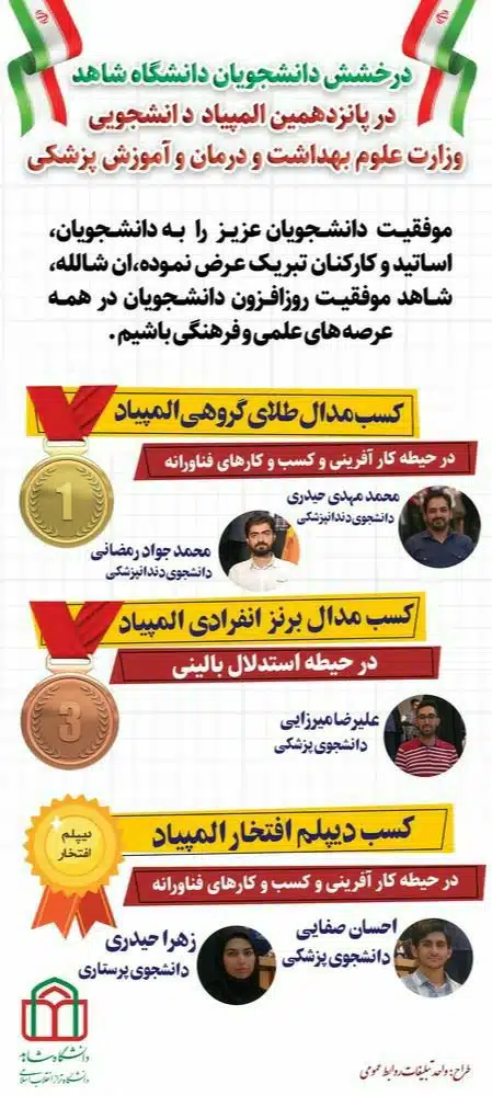 کسب دیپلم افتخار المپیاد در حیطه کار آفرینی و کسب و کارهای فناورانه توسط دانشجویان پزشکی و پرستاری: احسان صفایی و زهرا حیدری از جمله دستاوردهای دانشجویان دانشگاه شاهد در این دوره از المپیاد بود.