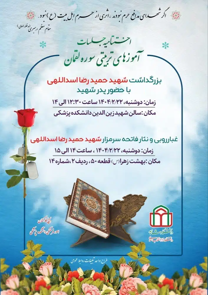 مراسم اختتامیه سلسله جلسات “آموزههای تربیتی سوره لقمان” با سخنرانی دکتر یکتایی، روز دوشنبه ۲۲ اردیبهشتماه از ساعت ۱۲:۳۰ تا ۱۴ در سالن شهید زینالدین (دانشکده پزشکی) برگزار میشود.